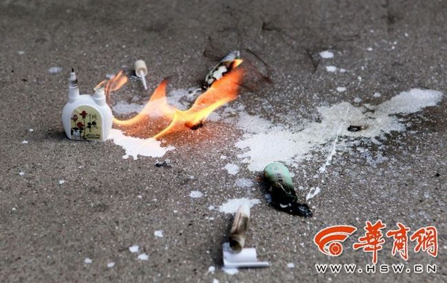 由于7支外包裝均為塑料材質,液體在塑料包裝內,當塑料包裝遇明火燒毀后,修正液瞬間引燃,火苗要比塑料燃燒得更旺。其中那只無任何警示標識的修正液,火勢較為猛烈,燃燒的修正液流到地上,火仍未熄滅。